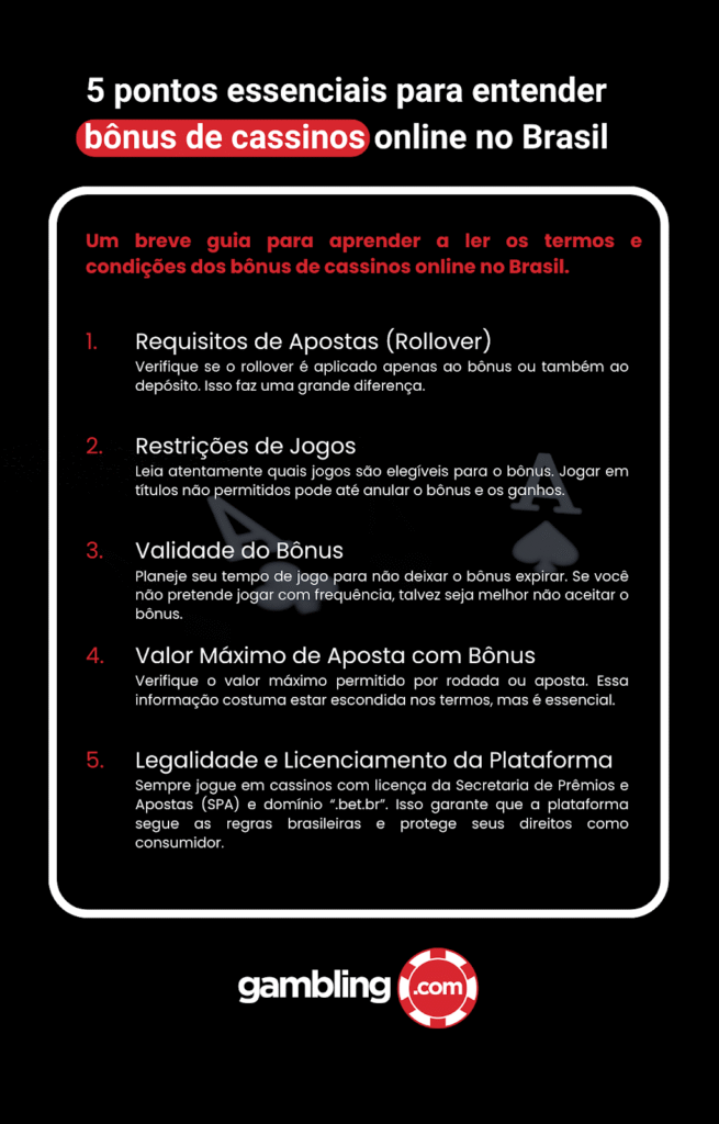 O guia preparado pela Gambling, principal autoridade independente em jogos online no Brasil, permite que você aprenda a ler os termos e condições dos bônus de cassinos online no Brasil.