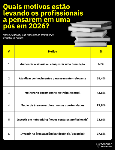 Para 2026, quais os planos dos profissionais brasileiros quando o assunto são os cursos de pós-graduação? Uma pesquisa recente, divulgada pela escola de negócios Conquer, questionou centenas de pessoas de diferentes áreas e descobriu a resposta: 56% dos entrevistados gostariam de iniciar uma pós no ano que vem… e já têm algumas áreas de interesse em mente.