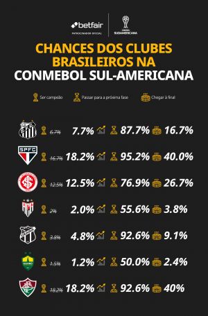 A Betfair também calculou as chances dos times brasileiros na Sul-Americana. Segundo a provedora de apostas esportivas, São Paulo e Fluminense aparecem como maiores favoritos ao título. São 18.2% de chances de conquistar o torneio – vale lembrar que o Flu entrou na disputa após ser eliminado na fase anterior da Libertadores 2022.