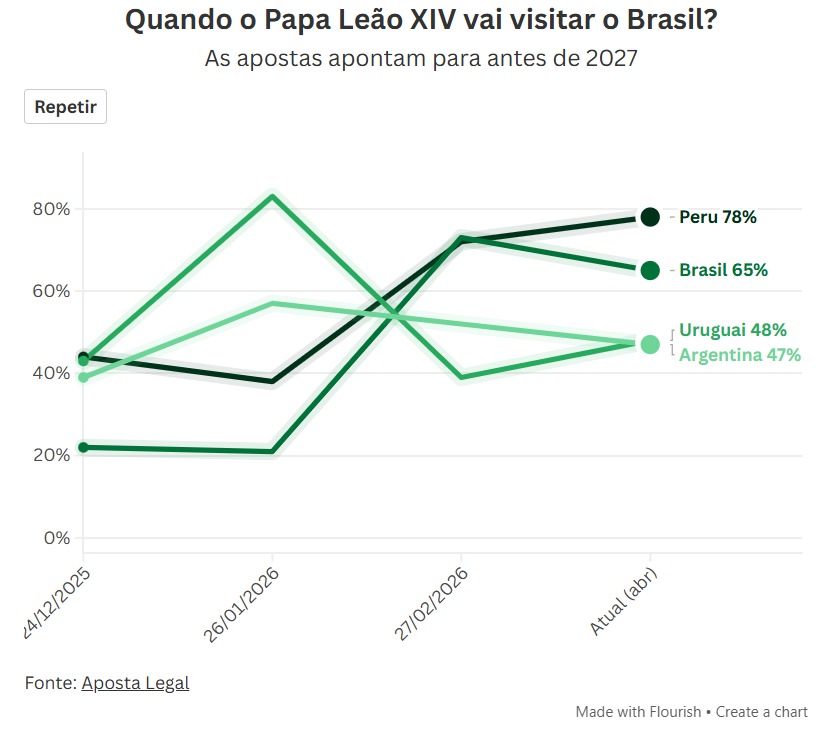 Na Kalshi, plataforma americana de mercados de previsão, o contrato “What countries will Pope Leo visit before 2027?” posiciona o Brasil com 65% de probabilidade, atrás apenas do Peru (78%), que lidera com folga por conta da ligação pessoal do papa com o país andino.
