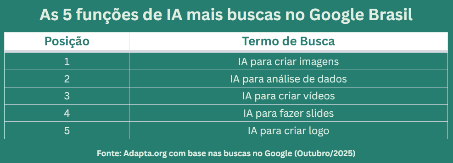 Diante do novo contexto, a Adapta, maior ecossistema de IA generativa do Brasil, realizou um estudo para identificar quais são as funções mais buscadas pelos brasileiros. O levantamento analisou um ano de métricas, de outubro/24 a outubro/25, e classificou as 5 funções com maior volume: criar imagens; analisar dados; criar vídeos; criar slides; e criar logo.