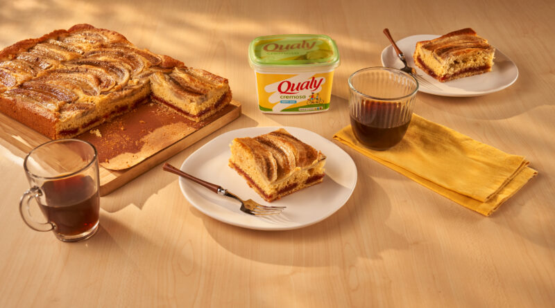 - O tamanho ideal da assadeira é a nº2, com 24x34cm e 5 cm de altura. Despeje metade da massa na assadeira untada com Qualy Cremosa Sem Sal e enfarinhada. Distribua fatias de goiabada sobre a massa.