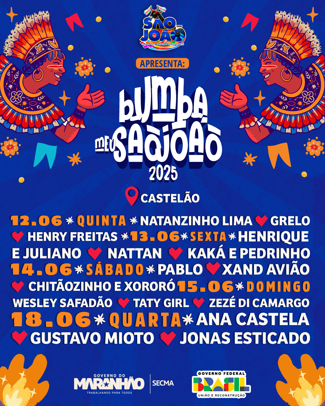 O Bumba meu São João será realizado no Estádio Castelão, no Outeiro da Cruz, em São Luís, local em que o público também cantará grandes sucessos com nomes consagrados da música como: Wesley Safadão, Taty Girl, Zezé di Camargo, Ana Castela, Gustavo Mioto e Jonas Esticado.
