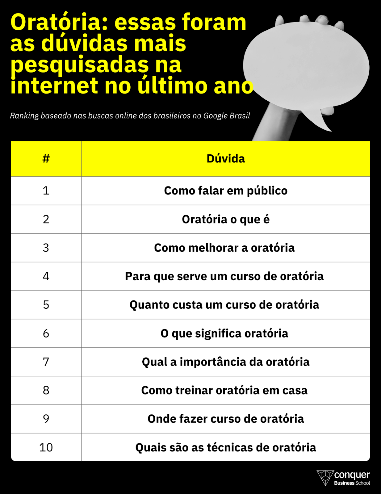 Para desvendar as principais dúvidas sobre oratória na internet, foram consideradas mais de 2 milhões de buscas no Google realizadas por brasileiros durante os últimos doze meses. A investigação foi pautada pela expressão “oratória”, “curso de oratória” e suas variações, abrangendo todas as pesquisas relativas ao assunto nas cinco regiões nacionais. Em seguida, os termos mais procurados foram dispostos em um ranking baseado no volume total de buscas ao longo do último ano.