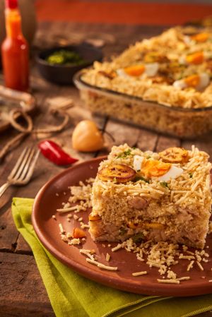 6. Em refratário, intercale camadas de farofa, pirarucu e banana-da-terra, finalizando com a farofa.