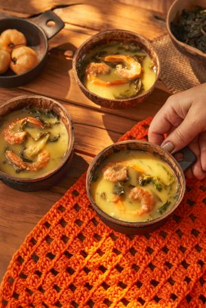 4. Monte em cumbuquinhas com um pouco de cada preparação: caldo tucupi quente, porções de mingau de goma, jambu e camarões. Sirva quente.