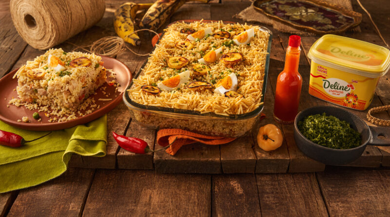 6. Em refratário, intercale camadas de farofa, pirarucu e banana-da-terra, finalizando com a farofa.