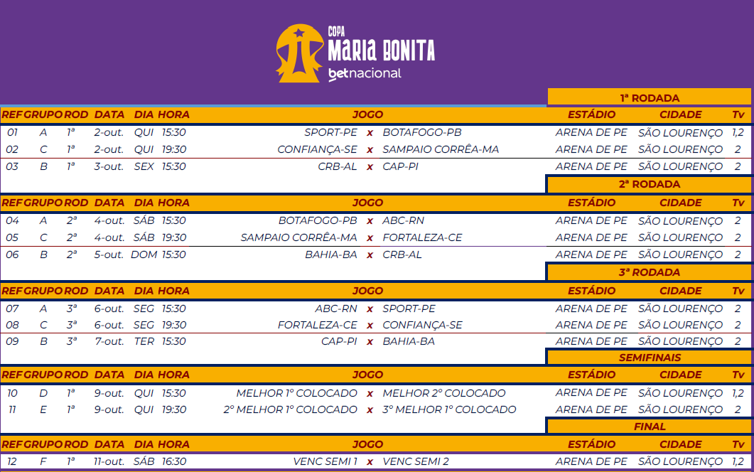 Com tabela e regulamento já definidos, o torneio será disputado em três fases: classificatória com três rodadas, semifinais e a grande final, totalizando 12 partidas em ritmo de decisão. No dia 2 de outubro, a Copa se inicia com dois jogos: às 15h30, o Sport-PE encara o Botafogo-PB, e às 19h30, o Confiança-SE enfrenta o Sampaio Corrêa-MA. No dia seguinte (3), é a vez do CRB-AL entrar em campo contra o Atlético Piauiense, às 15h30, encerrando a primeira rodada classificatória.