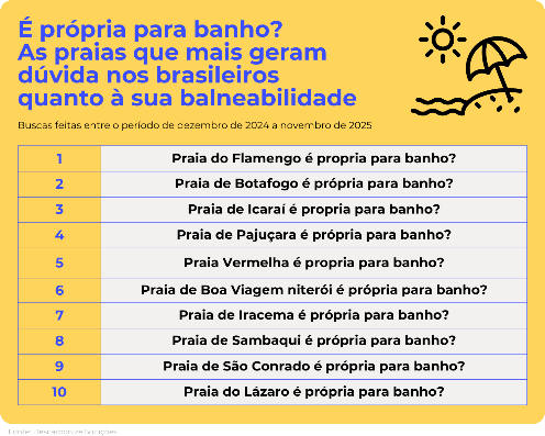 O interesse em entender o problema também cresceu: nos últimos 12 meses, as buscas pela pergunta “por que as praias ficam impróprias para banho?” aumentaram em 21%, o que demonstra um desejo dos brasileiros em compreender os fatores que comprometem a balneabilidade da água.