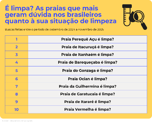 Nesse contexto, a busca por informações sobre praias consideradas mais limpas cresce no ambiente digital. Nesse cenário, a região Sudeste concentra o maior volume de pesquisas, com destaque para o litoral paulista, que ocupa 7 das 10 posições no ranking.