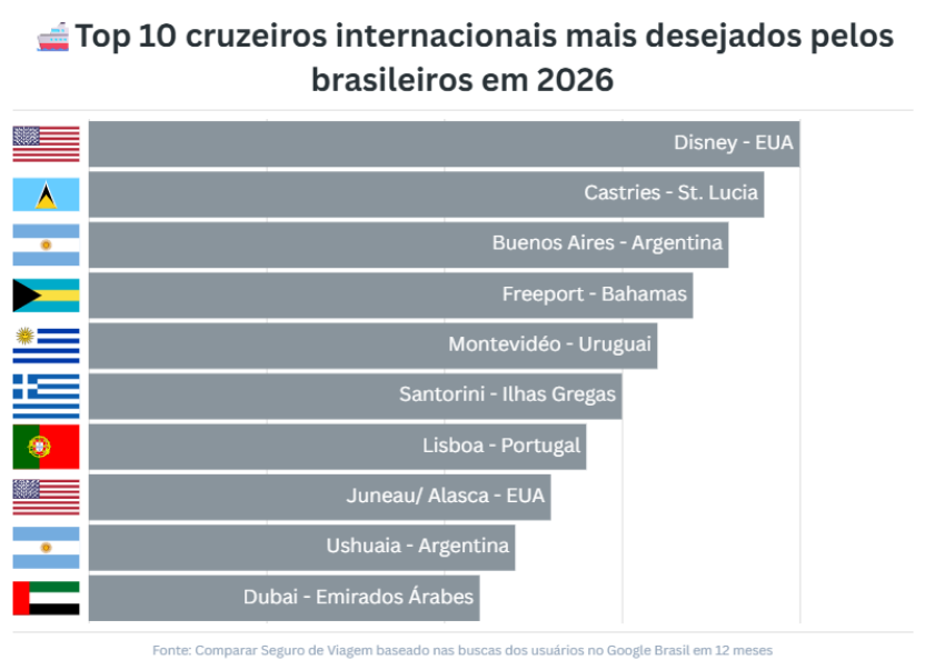 Para entender a intenção e quais locais são mais cobiçados pelos brasileiros, a Comparar Seguro mapeou os destinos de cruzeiros mais buscados. Para isso, analisou as métricas do Google no intervalo de um ano, entre outubro de 2024 e outubro de 2025. Na ordem decrescente, essas foram as escolhas mais frequentes: