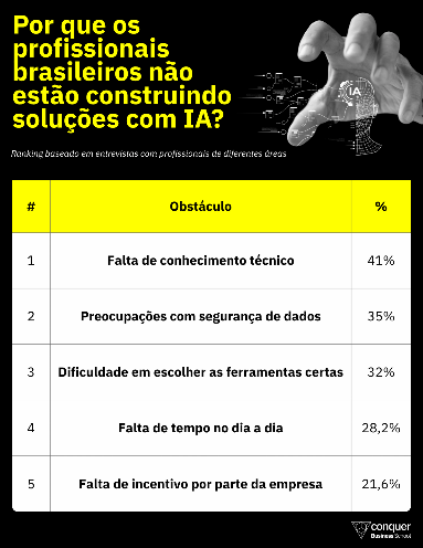 Ao longo do estudo, aliás, apenas 11,6% dos profissionais afirmaram utilizar a IA de forma avançada, criando soluções próprias ou desenvolvendo aplicações estruturadas. O número explica uma dor compartilhada por 9 em cada 10 respondentes: a sensação de ter ideias promissoras, mas ainda não ser capaz de colocá-las em prática.