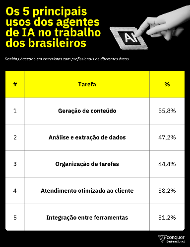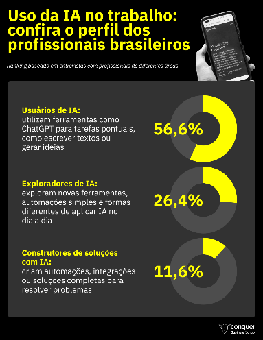 Os dados são da Conquer, escola de negócios que oferece cursos de liderança e desenvolvimento profissional e que, nas últimas semanas, investigou como pessoas de setores variados utilizam a IA no dia a dia, entre o uso de agentes e os desafios para passar do uso básico a aplicações mais estratégicas.