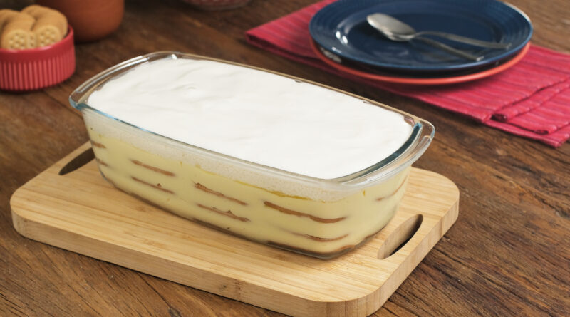 4 – Em um refratário, intercale camadas de creme e biscoito umedecido no leite.