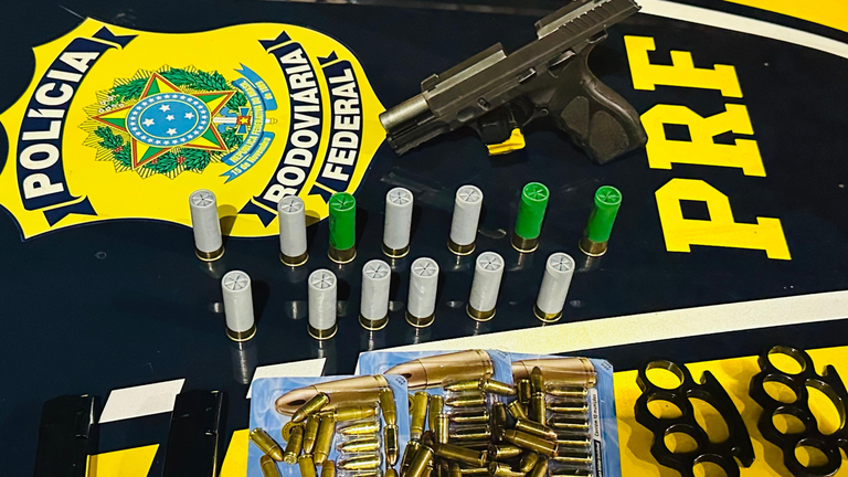 No decorrer da busca veicular, a equipe PRF encontrou uma pistola Taurus TH9, calibre 9mm, além de 105 munições calibre 9mm (7 não destinadas a treino), 15 munições calibre 38 (6 não destinadas a treino) e 13 munições calibre 12 (10 não destinadas a treino)