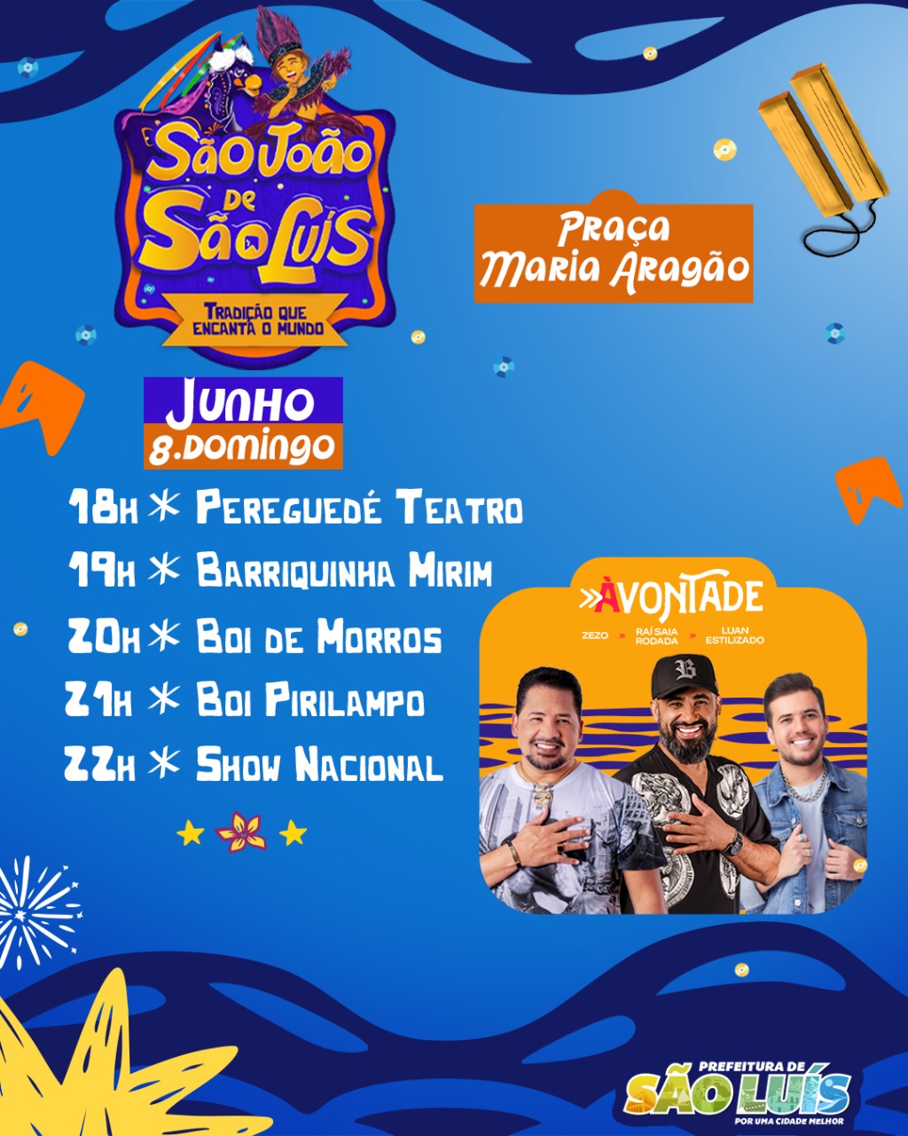 O Arraial da Cidade vai encerrar o primeiro fim de semana de descontração no domingo (8), iniciando às 18h, com a apresentação do Pereguedé Teatro, uma criação da escritora Camila Reis. Tem, ainda, o Barriquinha, dissidência do Boizinho Barrica, com elenco formado apenas por crianças; o Boi de Morros, sotaque de orquestra, do bairro Cohatrac, que se apresentará às 20h; e o Boi Pirilampo, criado no bairro Cohab.