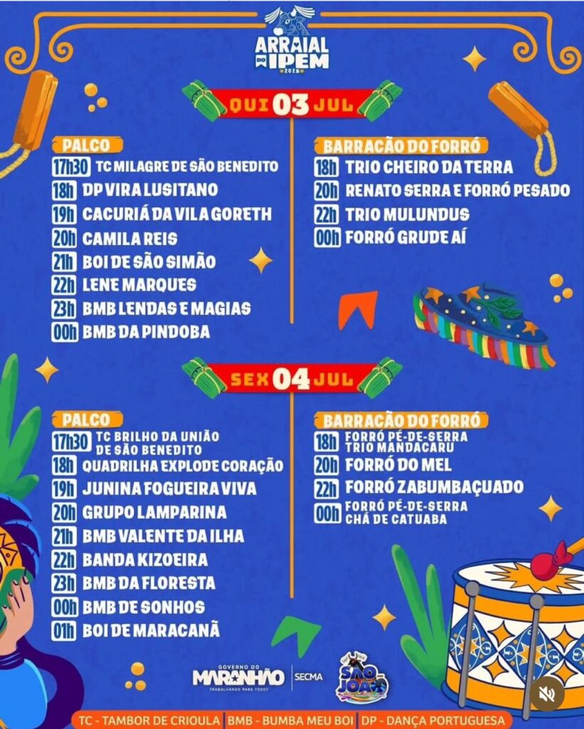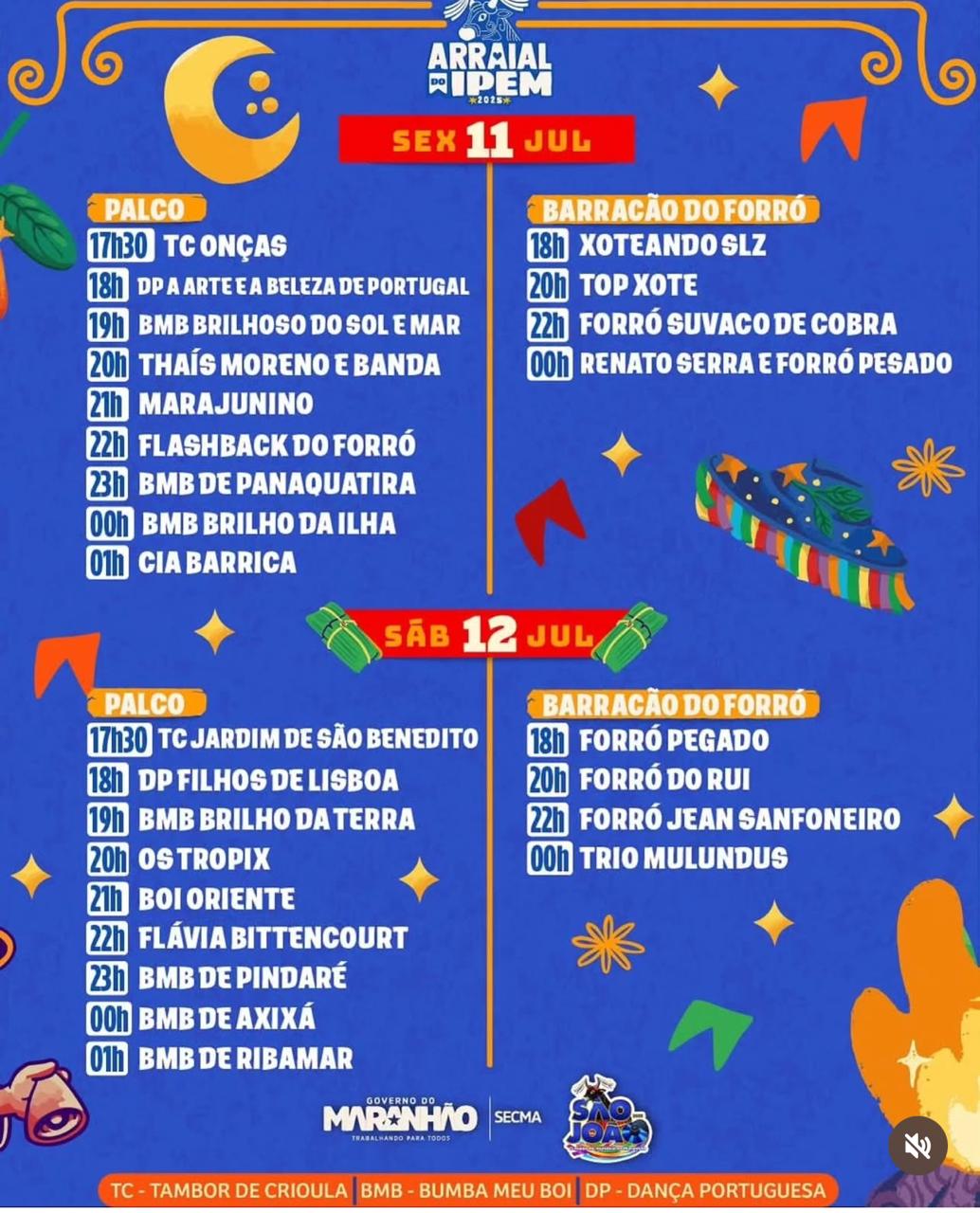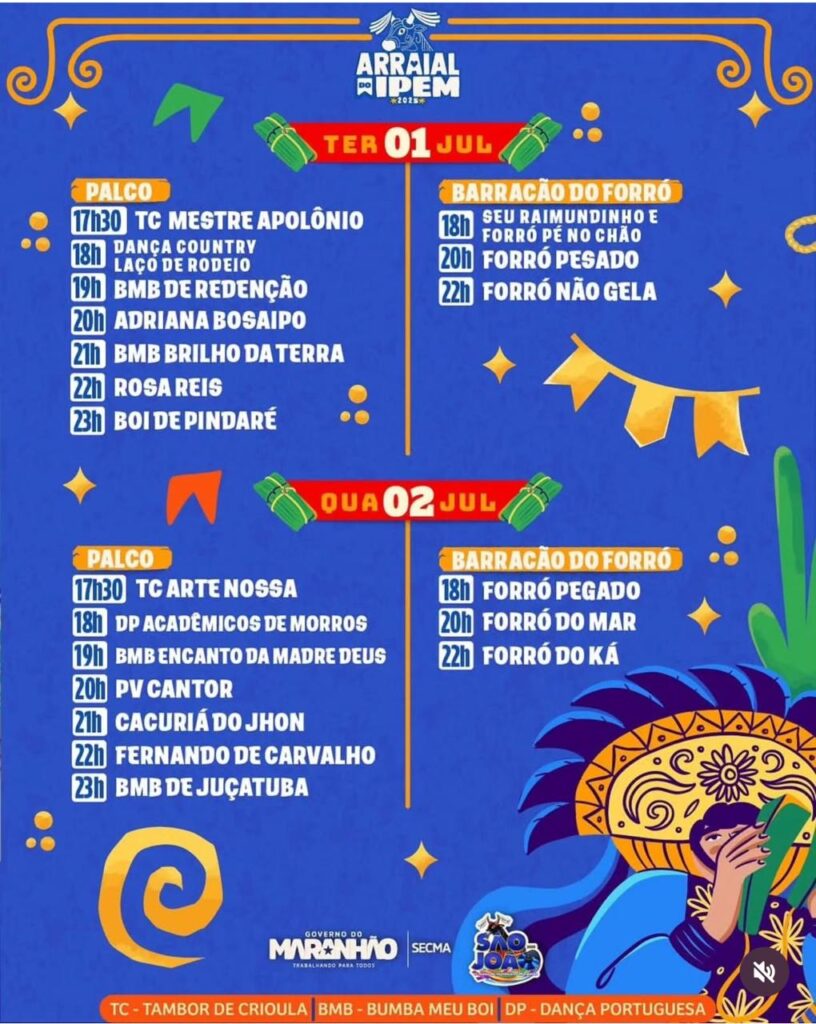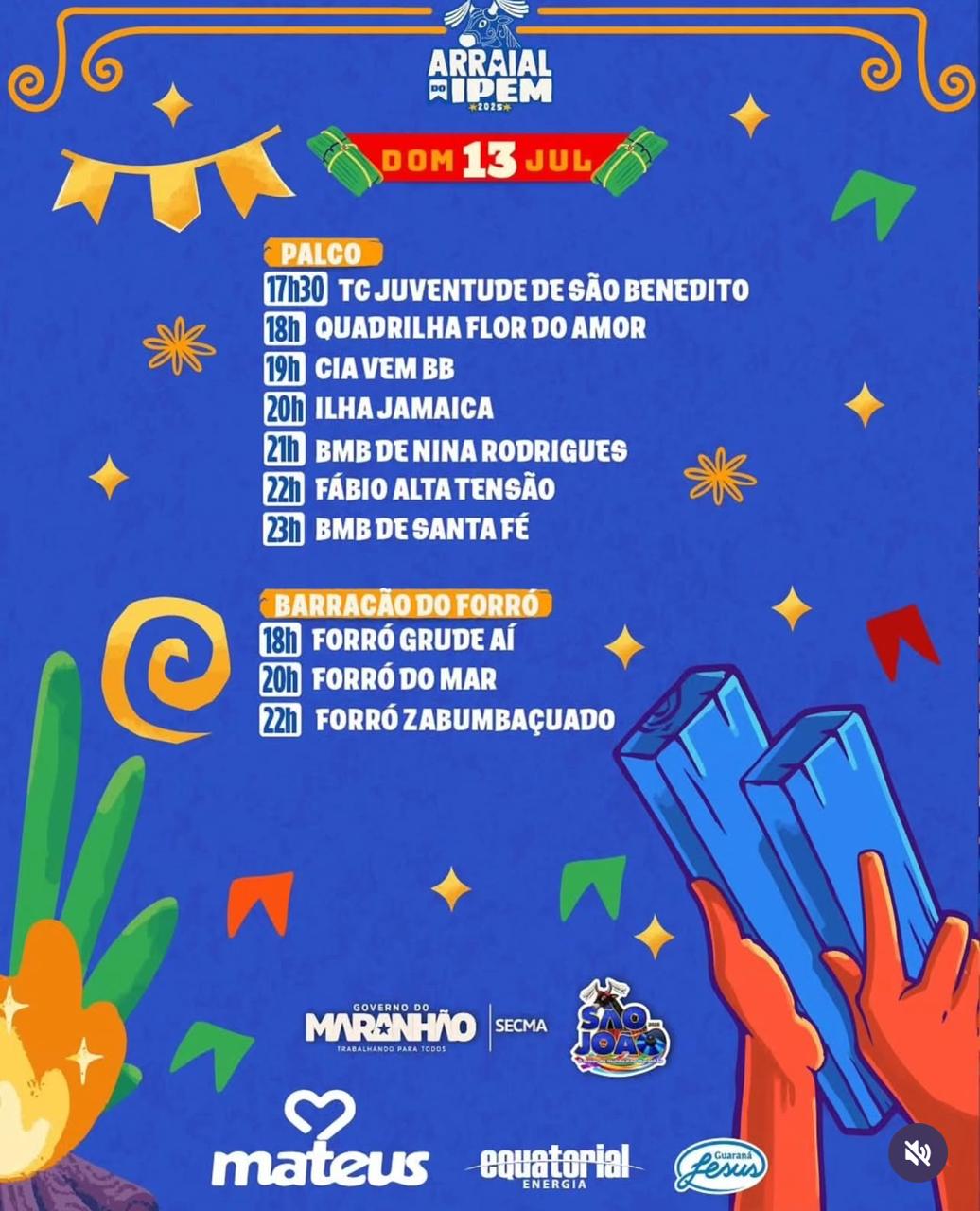 PlantãoSão João 2025Últimas Noticias Programação do Arraial do IPEM de 01 a 13/07 1 de julho de 2025 omaranhense Confira a programação do Arraial do IPEM