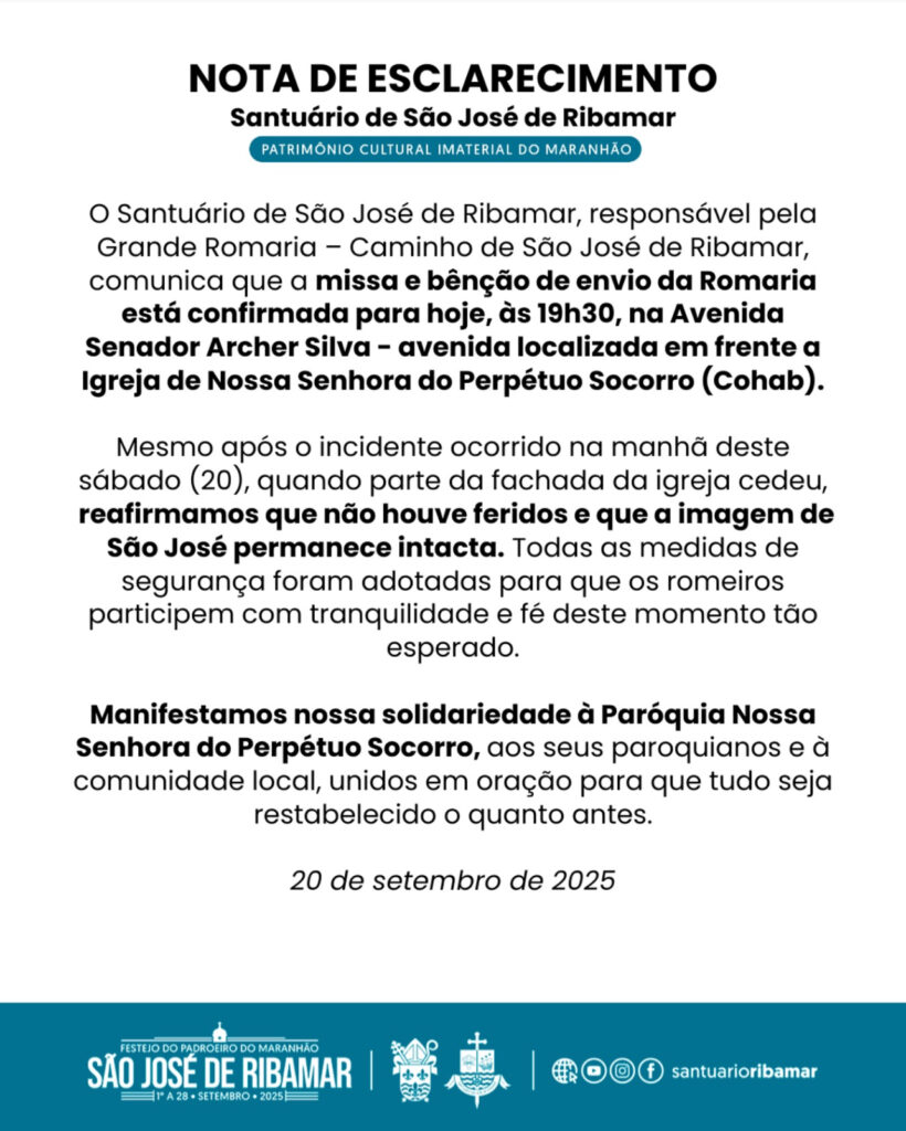 Giro de NoticiasÚltimas Noticias Santuário de São José de Ribamar divulga nota sobre missa e benção de envio da Romaria 20 de setembro de 2025 omaranhense