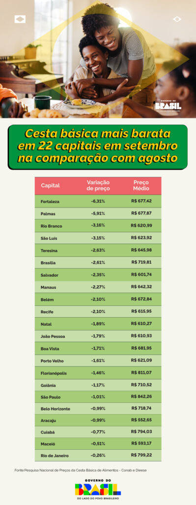 TRANSPARÊNCIA – “A redução do custo da cesta básica em boa parte das capitais é sinal de que as políticas do Governo do Brasil de abastecimento e apoio à produção de alimentos estão funcionando. A Conab e o Dieese trabalham para garantir transparência nos preços e contribuir com ações que assegurem comida de qualidade e a preços justos na mesa das famílias brasileiras”, afirma o presidente da Conab, Edegar Pretto.