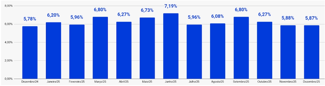 No período, o valor médio do condomínio ficou em R$ 828,13, o equivalente a 54,6% do salário mínimo vigente em 2025 (R$ 1.518). Na comparação com o mínimo atual (R$ 1.621), esse valor corresponde a 51,1%. Apesar da pressão sobre a taxa de condomínio, a inadimplência encerrou 2025 com média de 6,28%, leve queda de 0,02 ponto percentual frente a 2024. No ano, o maior nível foi registrado em junho (7,19%), e o menor, em dezembro (5,87%).