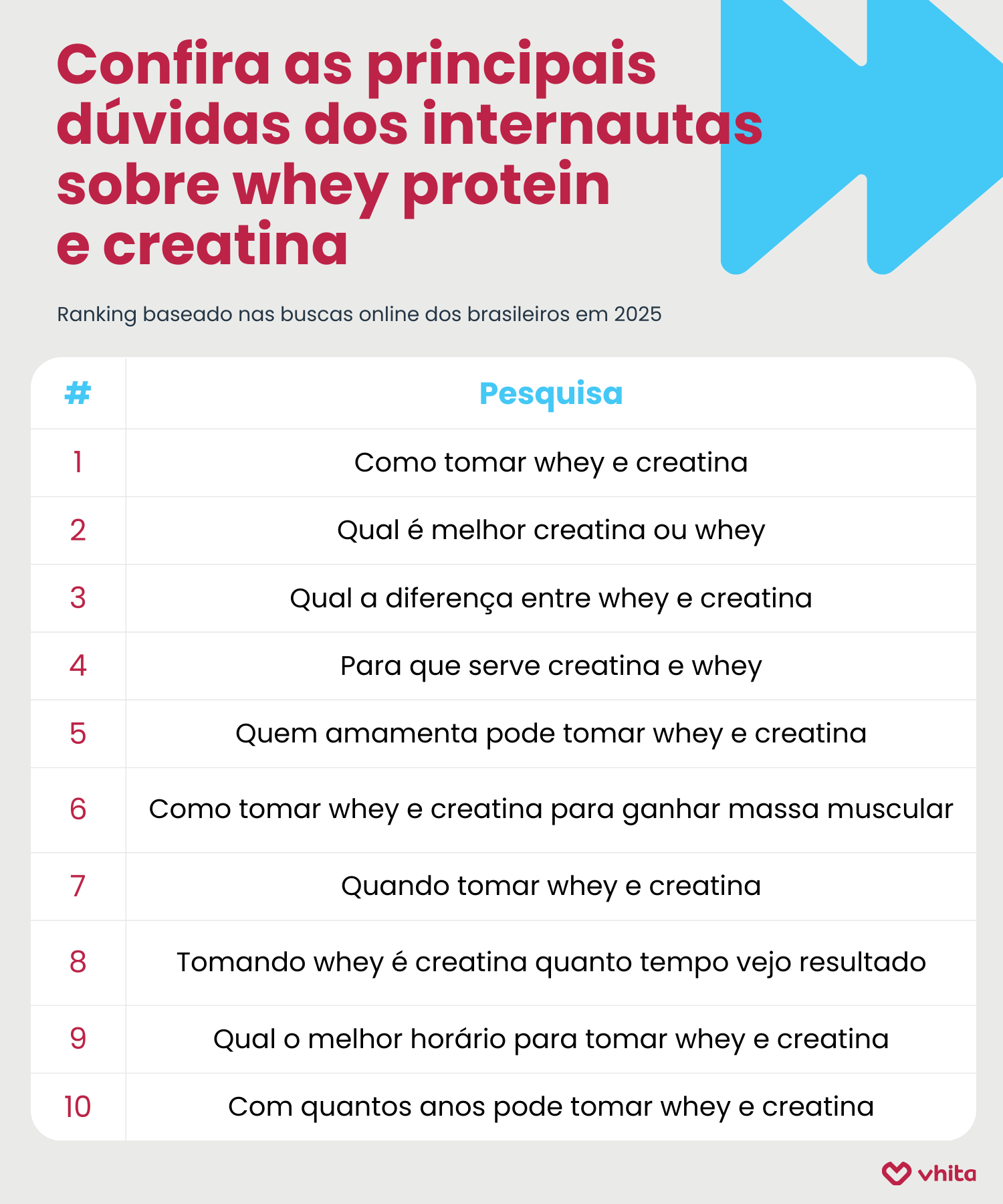 A Vhita resolveu investigar um ponto fundamental por trás desse volume de buscas: as principais dúvidas dos usuários sobre whey protein e creatina. Para chegar a uma resposta, a marca analisou as pesquisas mais populares relacionadas aos dois suplementos, organizando os questionamentos em um ranking exclusivo.
